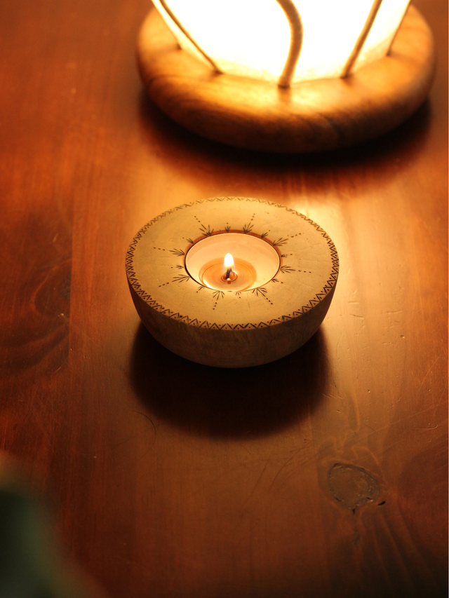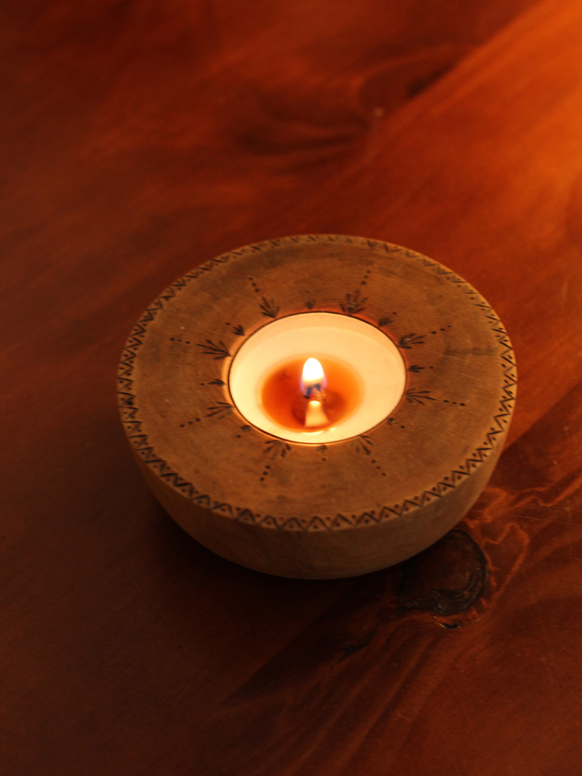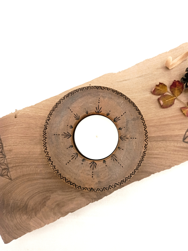 Un bougeoir en bois, tourné avec patience et pyrogravé avec délicatesse. Chaque pièce est unique, autant par le veinage du bois que par le motif gravé. Épuré et poétique, il est prêt à accueillir une bougie et à diffuser une lumière douce dans ton intérieur.