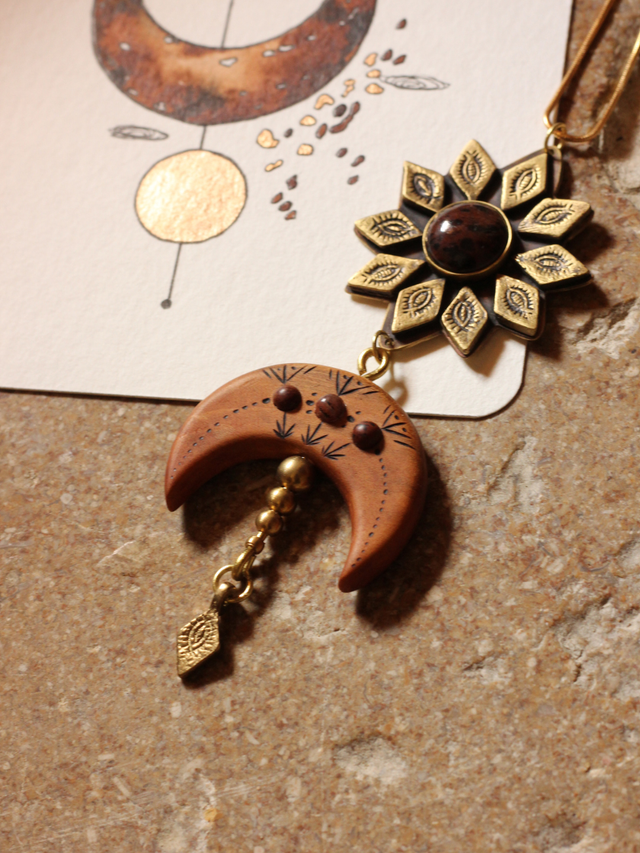 Une lune délicatement pyrogravée, une pierre choisie avec soin, un travail de bijouterie pour un talisman unique façonné à la main, mêlant bois, laiton et pierre fine.