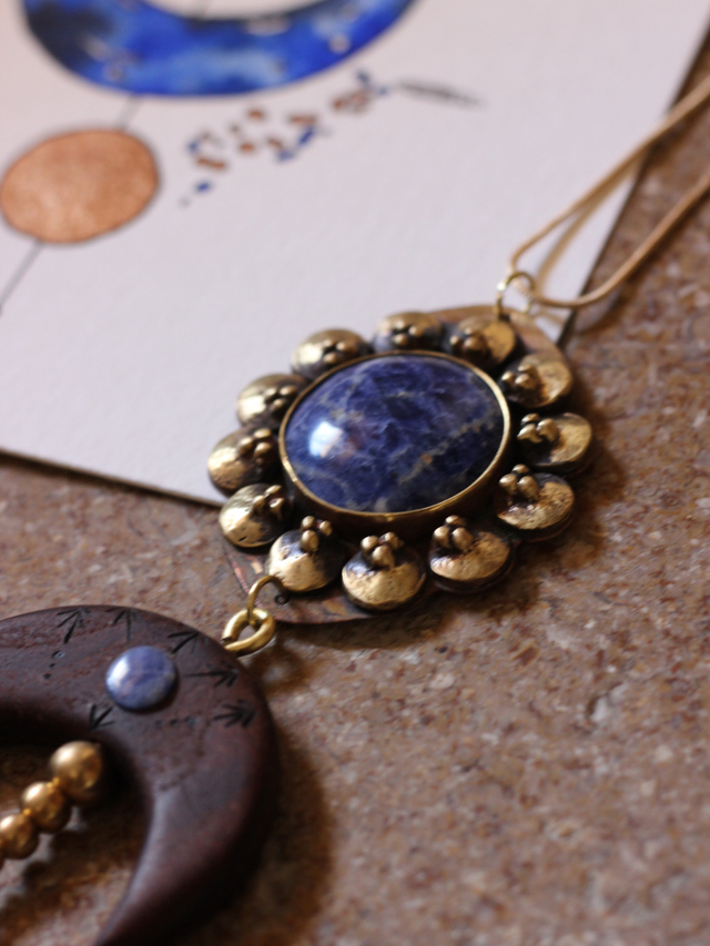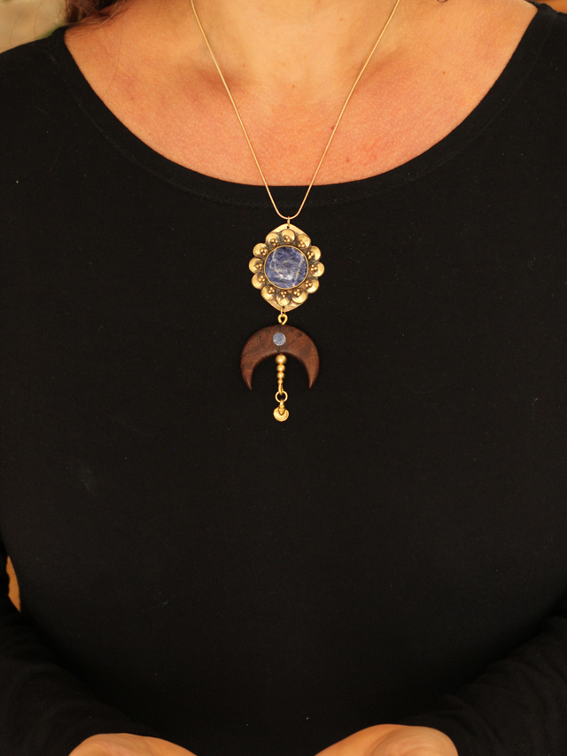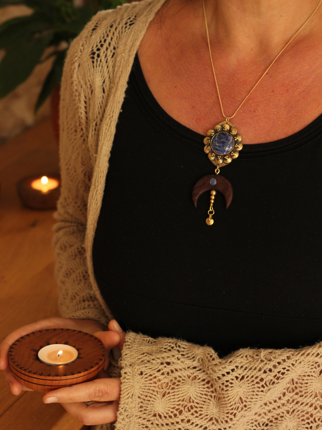 Une lune délicatement pyrogravée, une pierre choisie avec soin, un travail de bijouterie pour un talisman unique façonné à la main, mêlant bois, laiton et pierre fine.