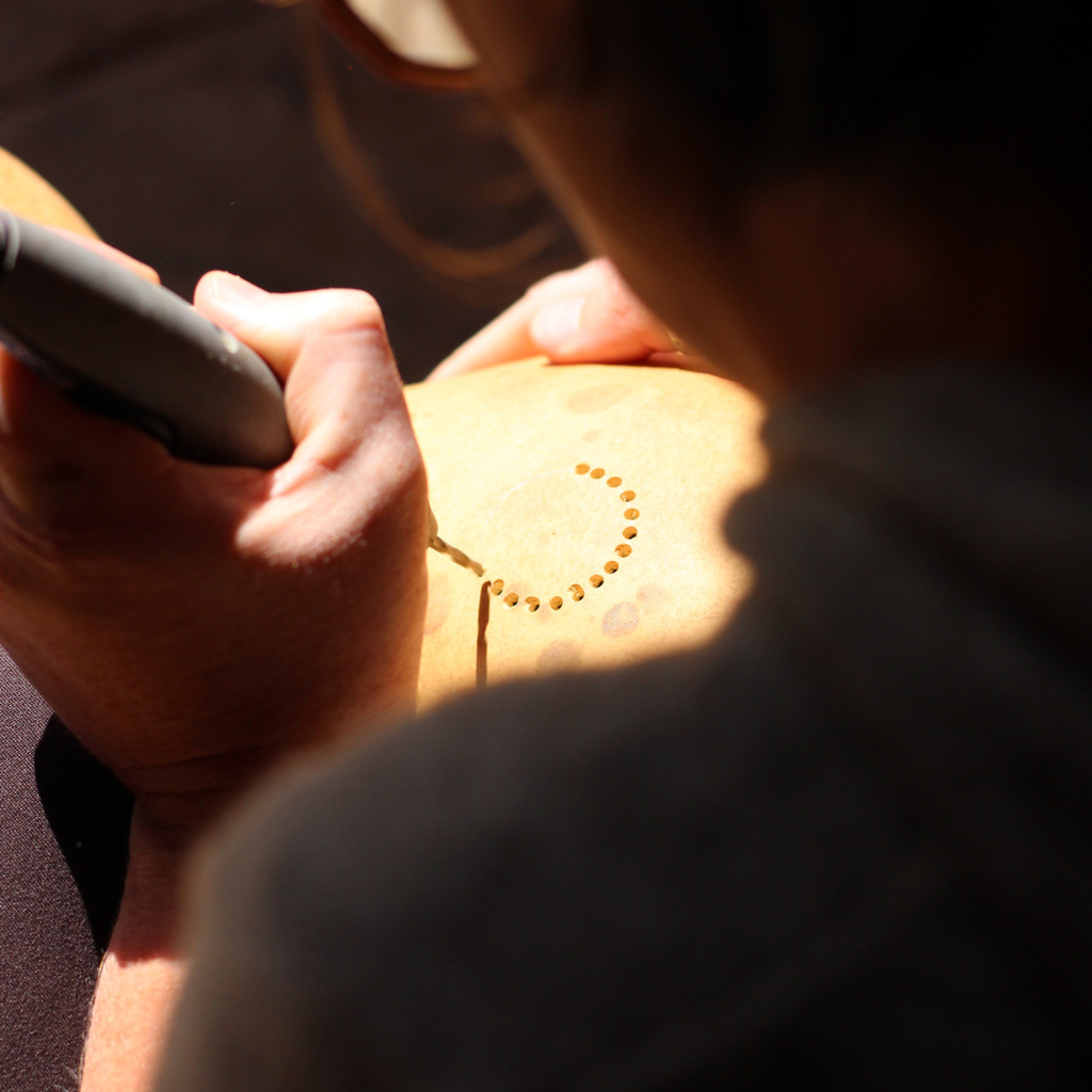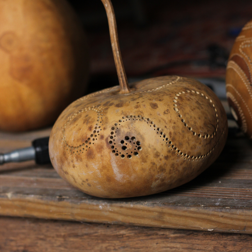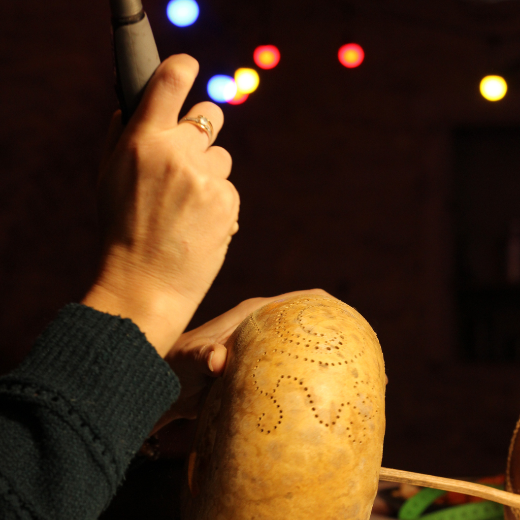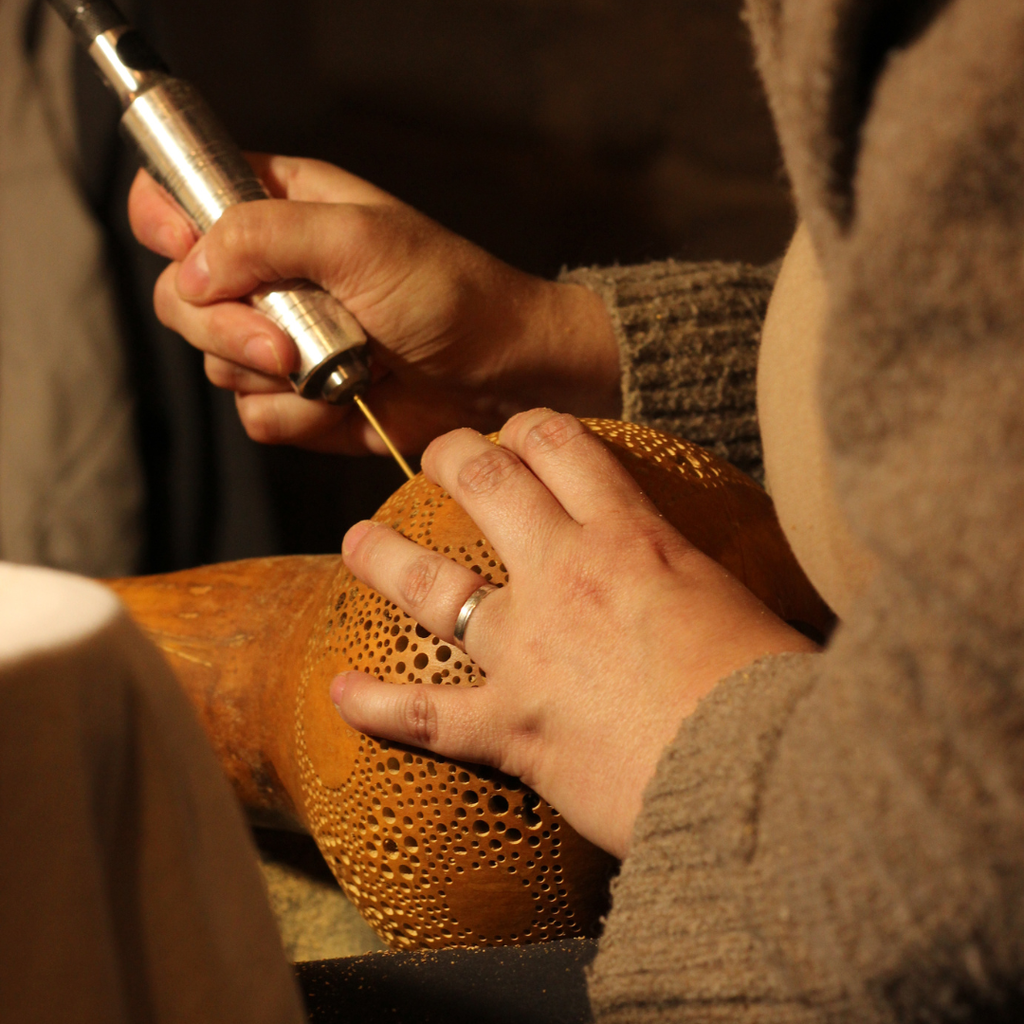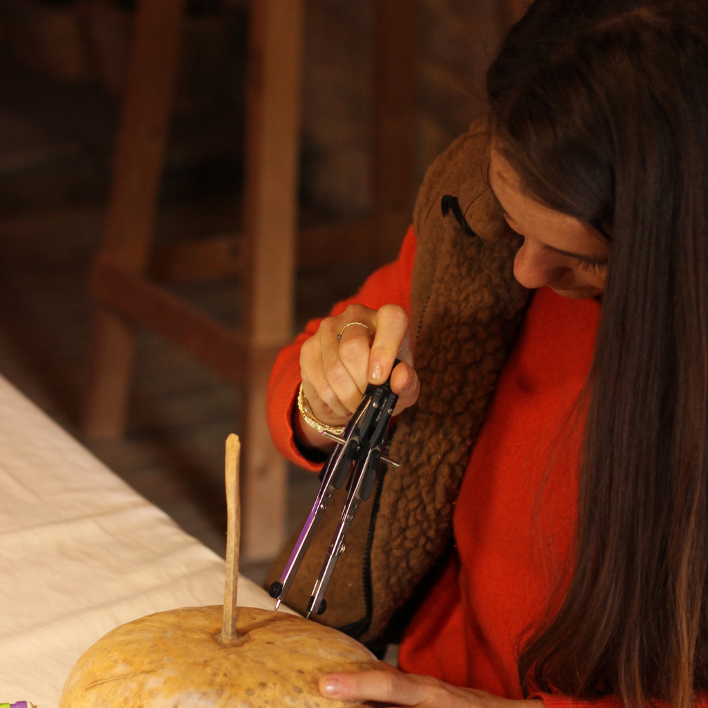 ✨ Le matin : choix et préparation de ta calebasse, premiers essais de sculpture sur calebasses d’entraînement, puis mise en place de ton dessin.