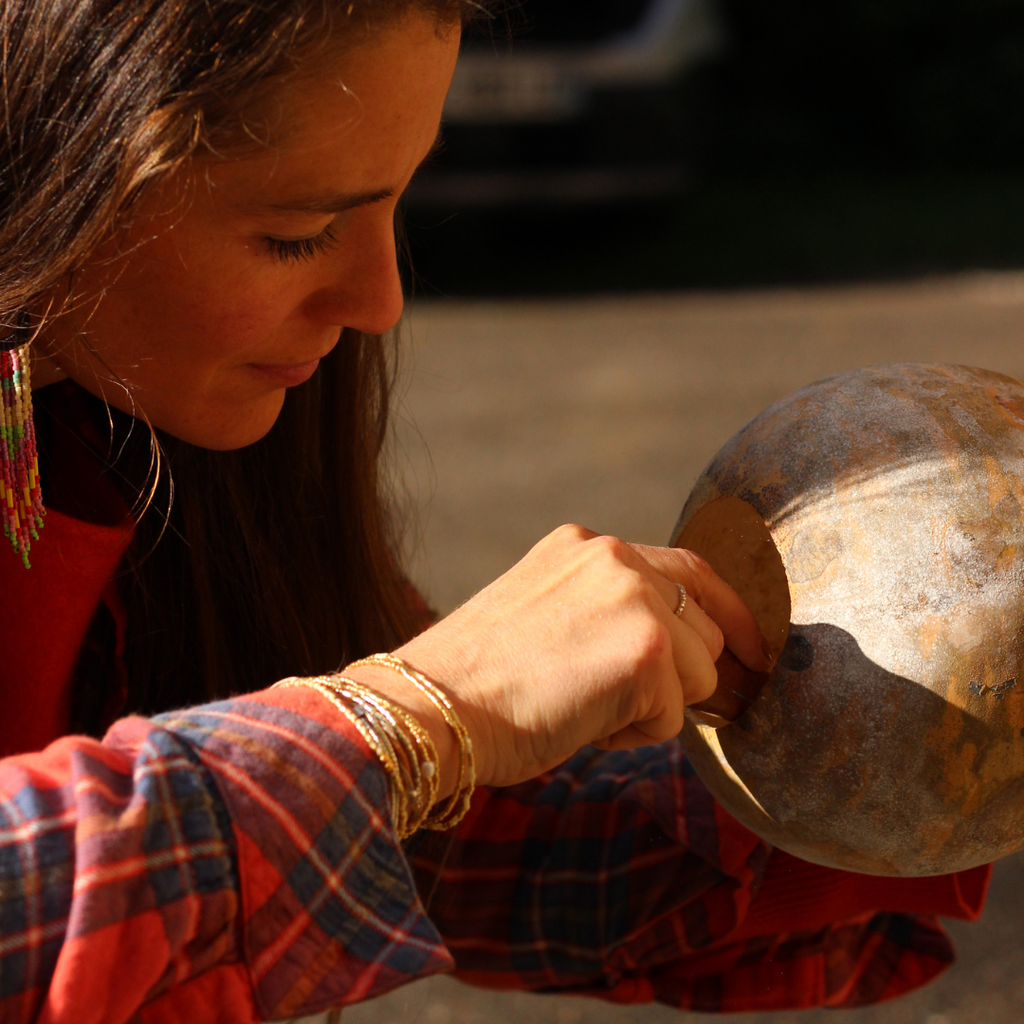 Lors de mon apprentissage et de mon premier stage, le pied n’était pas fourni : la calebasse était destinée à être suspendue, et chacun devait imaginer la suite chez soi.